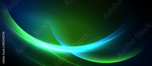 © antishock, Naklejka premium Abstract background features flowing curves, vibrant blues, greens. Smooth gradients create dynamic visual effect. Dark edges frame bright center.