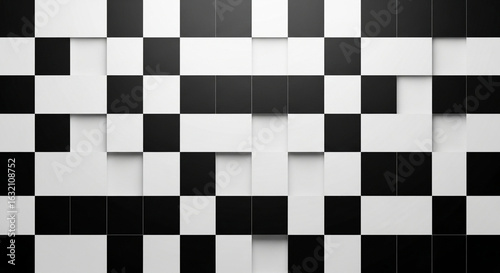 © Dimas Bayu, Fototapeta premium Abstract background featuring a distorted black and white checkerboard pattern. Digital glitch art with fragmented geometric squares creating a chaotic visual effect.