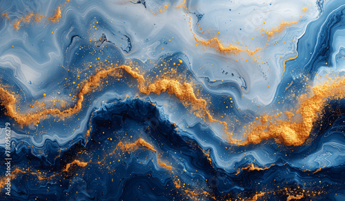 Fototapeta premium Abstract background featuring shades of blue and gold swirling together in a marble pattern. colors blend seamlessly to create a mesmerizing and visually striking background, Generative AI.