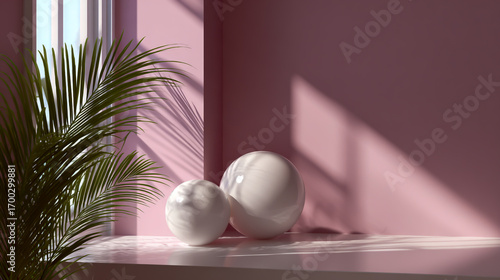 © Ashraf, Fototapeta premium Abstract background for product presentation with a white table, two spheres, and a palm leaf on a pink wall with a window shadow
