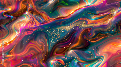 © Michael, Fototapeta premium Abstract background forming colorful wavy swirls and golden bubbles, ideal for illustrating luxury, celebration or fashion