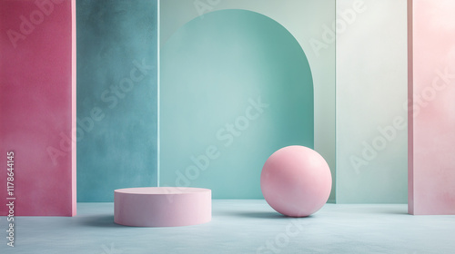Fototapeta premium Abstract background geometric shapes and lines in pastel pink, light blue and...