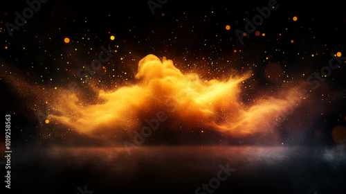 Naklejka premium Abstract background of a swirling orange cloud with gold glitter and bokeh lights.