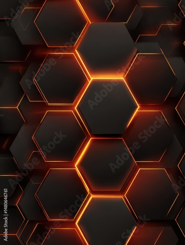 © Sarinya, Obraz premium Abstract background of black hexagons with glowing orange edges in a geometric pattern close up view