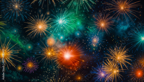 Naklejka premium Abstract Background of Colorful Fireworks Against a Starry Sky. Festive and Celebration . Colorful Fireworks Display Exploding in the Night Sky.