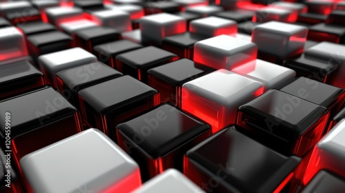 © yuan, Obraz premium Abstract background of glossy black and white cubes with red highlights.