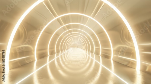 Naklejka premium Abstract background of modern architecture corridor, 3D rendering golden light tunnel with futuristic white neon light wall background.