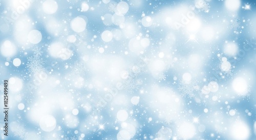 Fototapeta premium Abstract background of sparkling white bokeh lights and falling snow effect on a soft blue gradient, creating a magical and festive winter atmosphere for holiday design