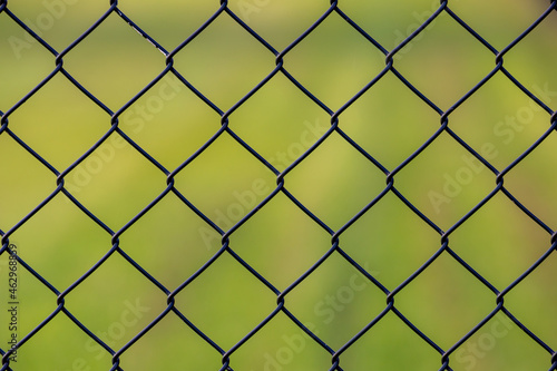 Fototapeta premium Abstract background, Old metal fence with wire mesh, Steel iron mesh net cage in the garden with green grass as backdrop.