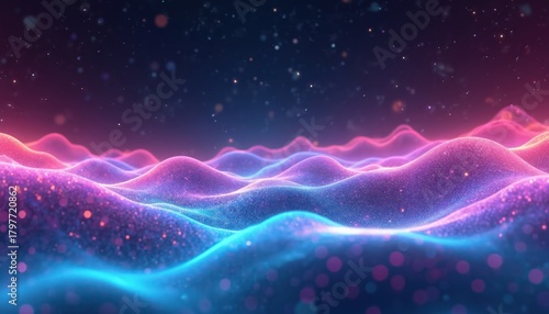 © Pete, Obraz premium Abstract background shows digital glowing neon waves. Bright particles sparkle on vibrant pink, purple, blue wavy surface. Dynamic energy pattern creates futuristic light effect. Modern tech concept