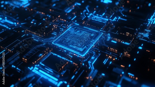 Obraz premium Abstract background with a blue circuit board pattern and glowing elements on...