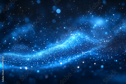 © Abstract, Obraz premium Abstract background with a soft neon blue glow, floating particles, deep smoke, and bokeh effect, creating a serene and dreamy atmosphere.