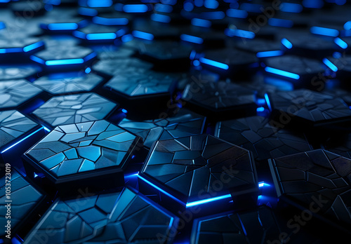 Obraz premium Abstract background with blue glowing hexagons on a dark gray wall, a futuristic design for a technology concept.