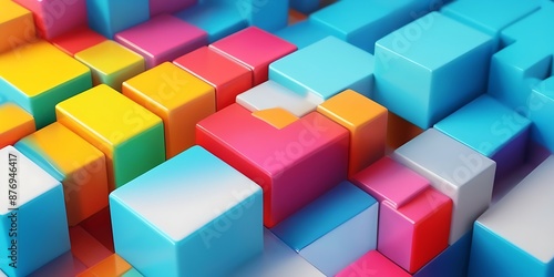 © Get it, Obraz premium abstract background with colorful shiny 3D cubes,neon, pattern, block, design, concept, square, business, cubes, render, illustration, construction, geometric, color, shape, tile, red, object,