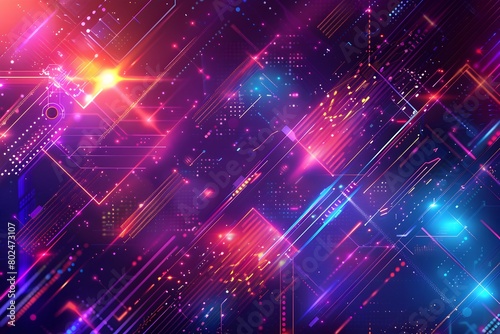 Fototapeta premium Abstract background with geometric shapes and neon lights, creating an atmosphere of futuristic technology and innovation Digital illustration with detailed textures and glowing effects for design use