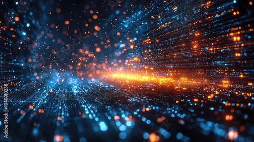 Obraz premium Abstract background with glowing blue and orange particles, creating a futuristic and digital feel.