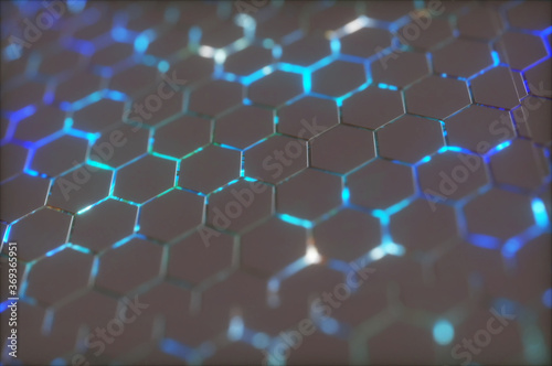 © de Art, Obraz premium Abstract background with glowing hexagons. Futuristic technology honeycomb mosaic. 3D render illustration