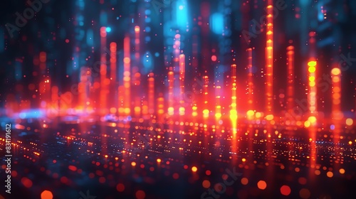 © Butsarakham, Obraz premium Abstract background with glowing red and blue lines and dots on a dark background.