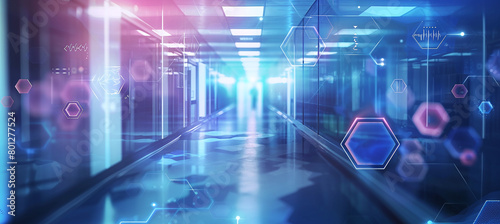 © Oleksandr, Obraz premium Abstract background with hexagonal shapes and technology icons on a blurred hospital corridor