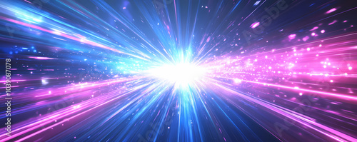 © DASHINKAN, Naklejka premium Abstract background with light beams and glowing lines in shades of dark blue, pink, and purple. Big data visualization. Digital technology concept.
