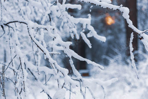 © Анна Павлюк, Obraz premium Abstract background with snow-covered branches on blurred background