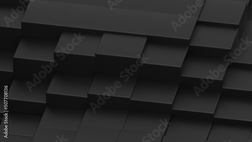 © DRN Studio, Naklejka premium Abstract background with waves made of a lot of black cubes geometry primitive forms that goes up and down under black-white lighting. 3D illustration. 3D CG. High resolution.