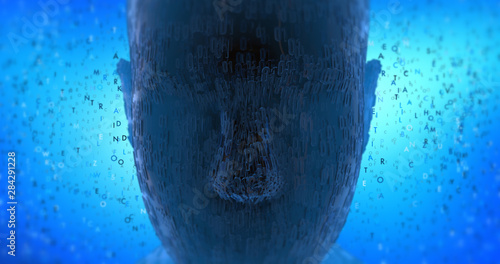 © Yucel Yilmaz, Fototapeta premium Abstract Bionic Robot Head With Symbols And Letters - Technology Related 3D Illustration Render Concept