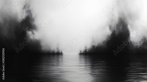 © Adrenaloby, Obraz premium Abstract. Black mist over calm water with a foggy horizon