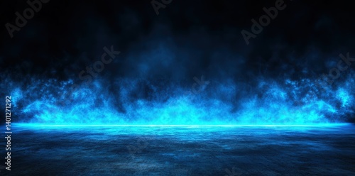 © Shelley, Fototapeta premium Abstract blue and black background with a spotlight on a concrete floor, featuring smoke in a dark room. Ideal for product presentations, mockups, and photo studio displays.