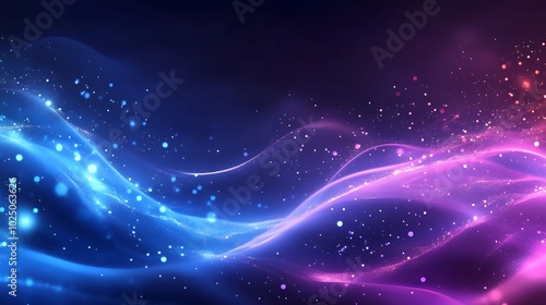 Fototapeta premium Abstract blue and pink glowing waves with glittering particles on dark background.