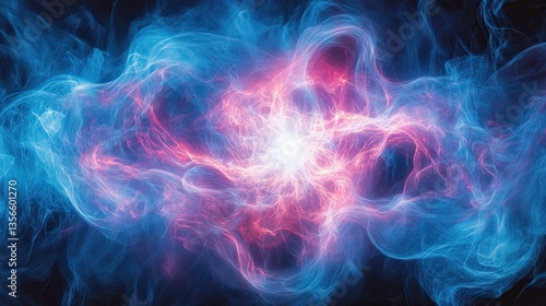 © Ikram studio, Fototapeta premium Abstract blue and pink light streaks merge into a bright white center against a dark background.