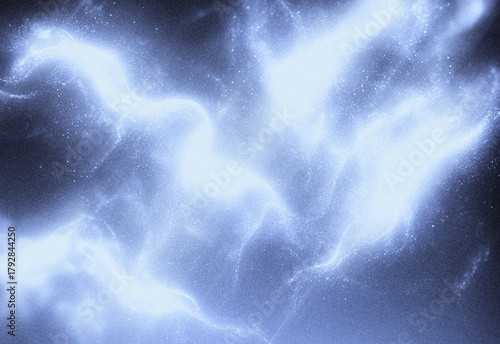 Naklejka premium Abstract blue and white smoky wisps swirl across a dark background with glowing particles, creating a surreal ethereal atmosphere for tech, science, and creative projects