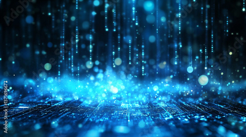 Obraz premium Abstract blue background with falling light particles and circuit board...