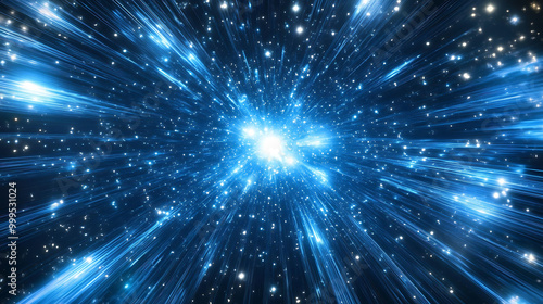 Fototapeta premium Abstract blue background with glowing light rays and stars.