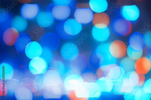 © Yulia, Fototapeta premium Abstract blue bokeh lights background. Blurred colored lights garlands. Beautiful Christmas and New Year background.