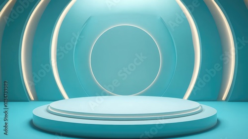 © chesleatsz, Obraz premium Abstract Blue Circular Platform with White Luminous Arcs