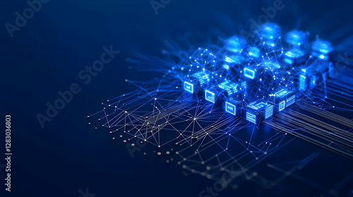 Fototapeta premium Abstract Blue Digital Network with Glowing Nodes and Data Lines in Dark...