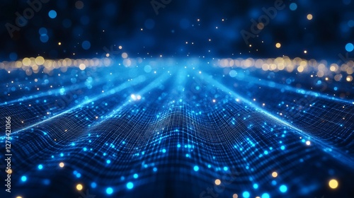 © Blueloner, Fototapeta premium Abstract Blue Digital Wave Background with Glowing Particles and Network Mesh