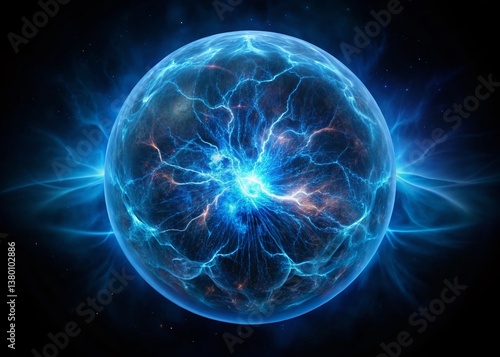 © Danicha, Naklejka premium Abstract Blue Electric Plasma Sphere Lightning Storm Dark Background 3D Render