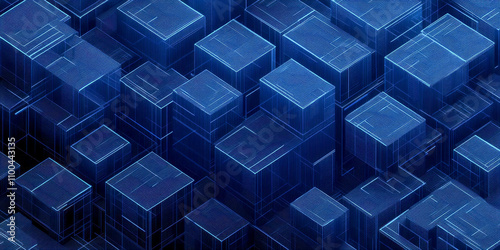 © Atmospheric stock, Obraz premium Abstract blue geometric cube pattern with neon grid lines