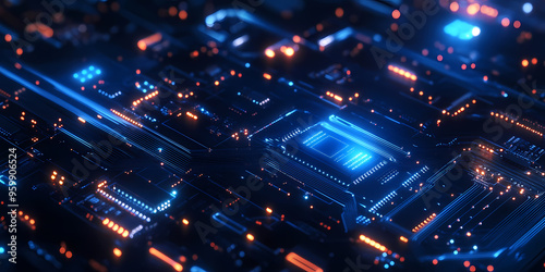 Fototapeta premium Abstract blue glowing circuit board with chips and transistors