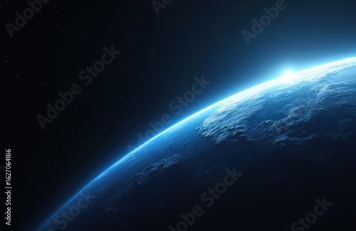 © Vadym, Obraz premium Abstract blue gradient space background with glowing light beam over planet Earth. Dark atmosphere, vast cosmos with stars, earth shadow creates deep, cosmic feel. Ideal for design, banner, wallpaper
