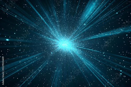 © Siasart Stock, Fototapeta premium Abstract Blue Light Rays Burst from Center with Particles Dynamically Scattered Across Dark Background