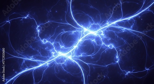 © Mohammad, Naklejka premium Abstract blue lightning energy discharge with fractal patterns on a dark blue background design 100
