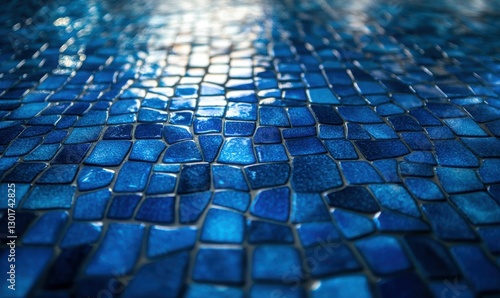 Naklejka premium Abstract blue mosaic tiles glowing under soft ambient lighting, creating a...