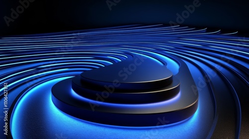Obraz premium Abstract blue neon light on a 3D circular platform.
