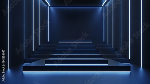 © gita, Fototapeta premium Abstract blue neon lit staircase in a dark room.