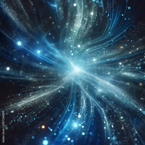 Fototapeta premium Abstract blue space background with white rays and glowing stars.