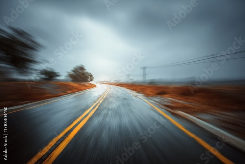 © Iftikhar alam, Naklejka premium Abstract blur of a winding motor road in rainy weather with dark clouds and a sense of motion captured in the background