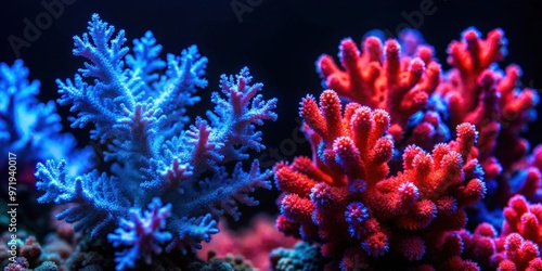 Fototapeta premium Abstract blur red and blue coral in a black background, coral, abstract,...